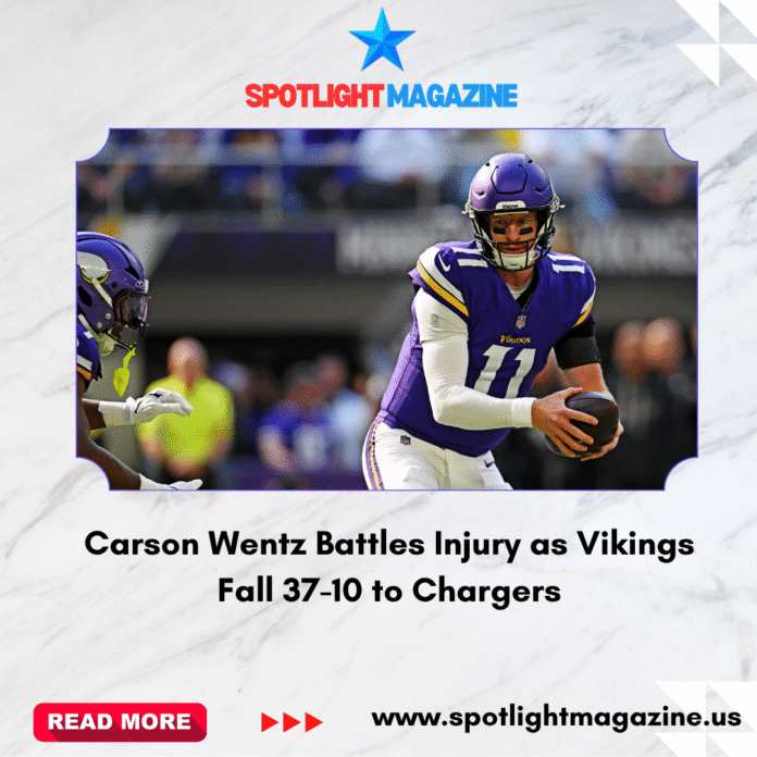 Carson Wentz fought through pain and frustration on Thursday night, but it wasn’t enough to save the Minnesota Vikings from a tough 37-10 loss to the Los Angeles Chargers. Playing with his left shoulder in a brace and clearly struggling with limited strength in his throwing arm, Wentz pushed through what might have been his final start before rookie quarterback J.J. McCarthy returns from injury.