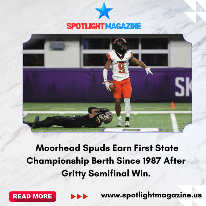The Moorhead Spuds football team is heading to the Minnesota State Championship for the first time since 1987 after a determined and disciplined performance in Minneapolis. Playing at U.S. Bank Stadium on Friday, the Spuds earned a hard-fought 26-14 win over Lakeville South in the Class 6A semifinal, a game defined by strong defense, patient offense, and big plays at critical moments.